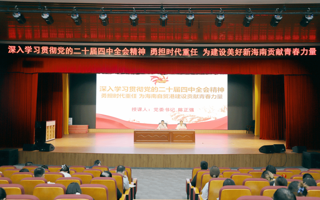 12月17日,我校党委书记陈正强以《深入学习贯彻党的二十届四中全会精神 勇担时代重任 为自贸港建设贡献青春力量》为题讲授专题思政大课。学校党委委员、副校长苑德宇主持思政大课。各基层党支部书记、学生代表近400人聆听此次思政大课。
