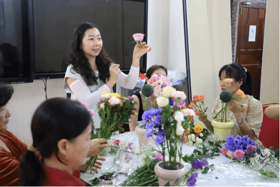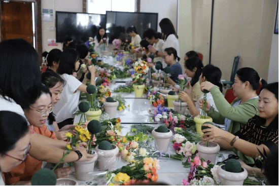 活动现场花香四溢,营造出和谐愉悦的氛围。学院妇委会为教师准备了花材、花篮和插花工具,还邀请资深花艺专家现场指导。专家讲解花卉挑选、色彩搭配等基础知识点,并展示多种插花造型。女教师们暂搁工作,投入花艺创作,发挥想象与创新精神,将鲜花绿叶组合成独具匠心的作品。活动现场欢声笑语,教师们在感受、欣赏、创造美的过程中愉悦身心、缓解压力、加深情谊。参与活动的女教师称,这份教师节礼物温暖贴心,活动让大家学到插花技艺、提升审美情趣,感受到学校的重视与关爱。她们表示会以更饱满的热情投入未来工作,为学院发展贡献力量。