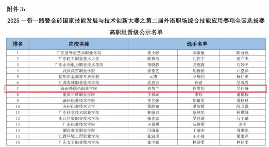 11月2日,2025"一带一路暨金砖国家技能发展与技术创新大赛"之第二届外语职场综合技能应用英语赛项全国总决赛在天津商务职业学院圆满落幕。我院古帮兰、白雪怡、吴佳韩三位同学组成的代表队发挥出色,凭借扎实的专业功底、出色的职场应用能力与卓越的团队协作精神,从来自全国各高校的342支参赛队伍中脱颖而出,以晋级赛第7名的优异成绩闯入总决赛,最终斩获总决赛全国二等奖,廖完美、钟阳惠获评“优秀指导教师”。这是我校着力培养学生“外语应用、商贸知识、实践技能”三位一体核心竞争力的生动体现。