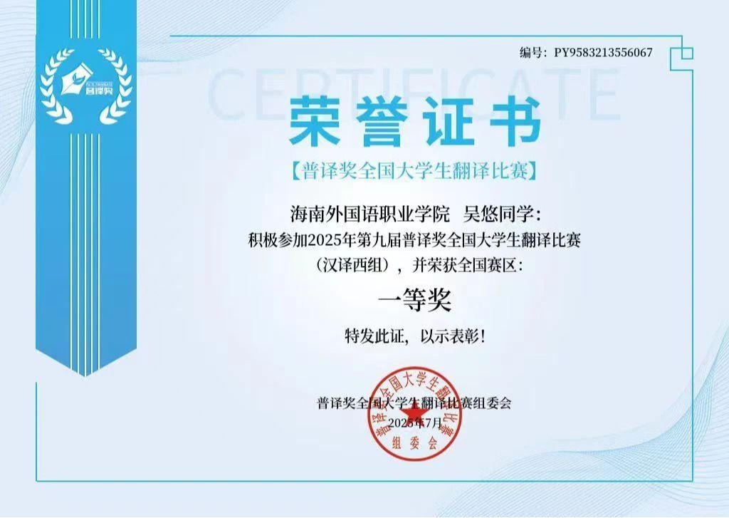 喜报!我校学生斩获2025年第九届普译奖全国大学生翻译比赛一等奖银奖(全国第二名)!
