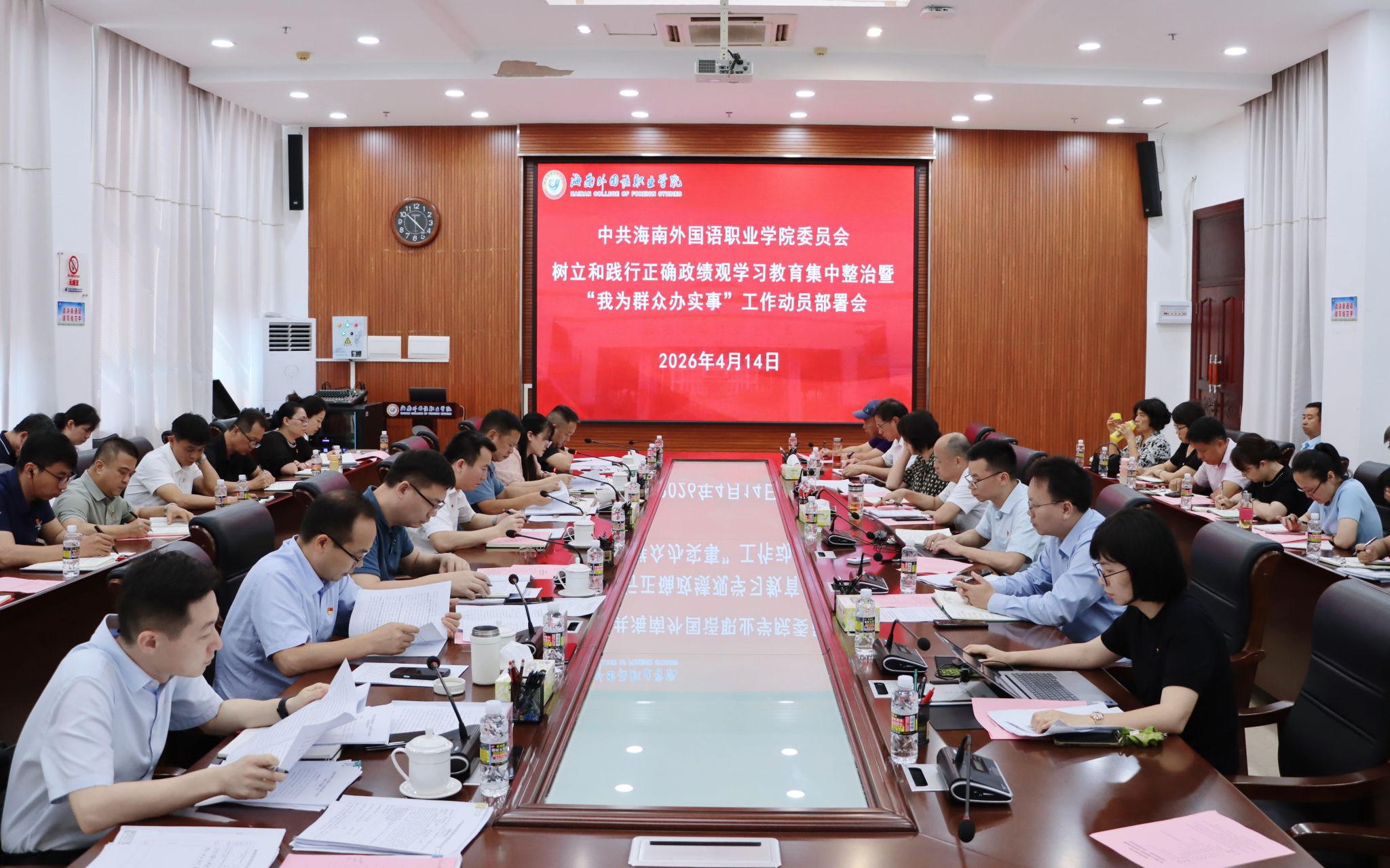 会议传达海南省树立和践行正确政绩观学习教育集中整治暨“我为群众办实事”工作动员部署会精神,对学校集中整治工作方案、“我为群众办实事”工作方案作了解读。我校将根据中央和省委要求,结合学校实际,重点开展8个问题的集中整治;用心用情实施解决师生办事流程复杂“跑腿多”问题等校级“我为群众办实事”事项。