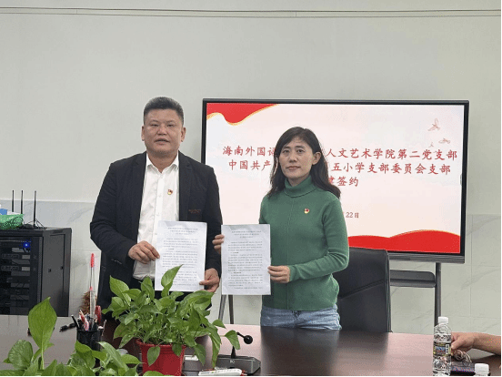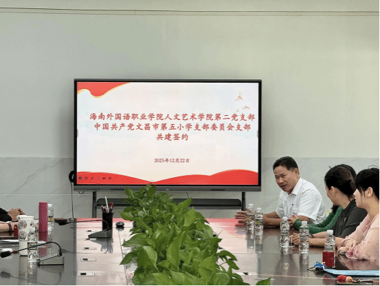 签约仪式上,双方党支部负责人分别介绍了各自党组织建设、党员队伍构成及特色工作开展情况。海南外国语职业学院人文艺术学院第二党支部依托学院专业优势,在文化艺术教育、志愿服务等方面积累了丰富经验;文昌市第五小学党支部深耕基础教育一线,聚焦学生全面发展和校园文化建设。双方一致认为,此次结对共建是落实主题教育等要求的生动实践,更是校地党组织优势互补、资源共享的重要举措。通过签订共建协议,双方将建立常态化沟通机制,围绕“理论联学、组织联建、活动联办、资源联享、品牌联创”等五个维度开展党建联盟,把党建工作与教育教学实践紧密结合,让党员在服务群众、服务教育中发挥先锋模范作用,有效增强基层党组织的政治功能和组织力,推动党建与业务深度融合,最终以高质量党建引领双方教育事业高质量发展,构建共建共治共享的良好格局。