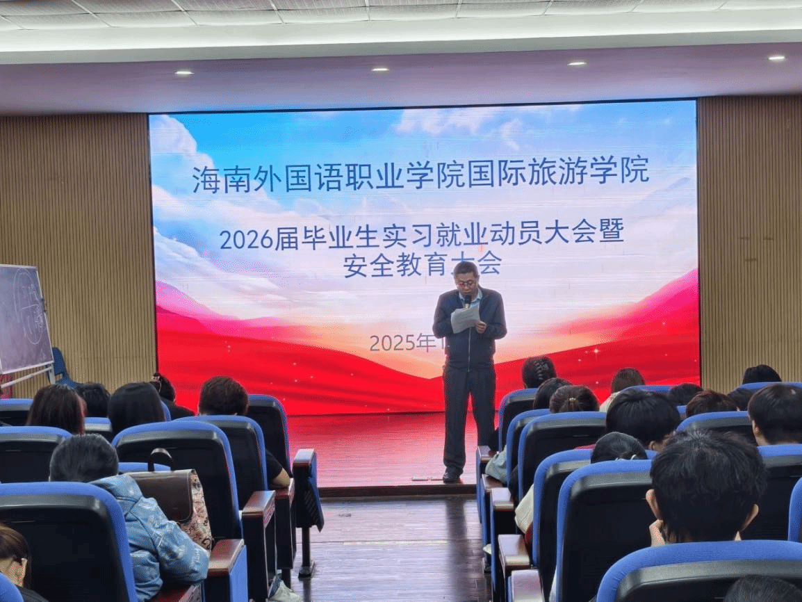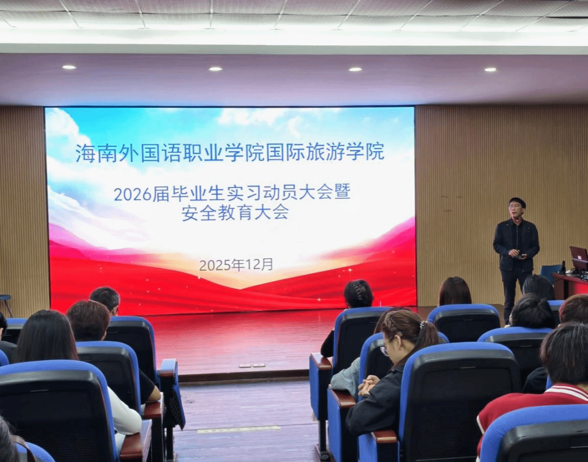 为切实做好学生实习组织工作,强化安全意识,拓宽就业视野,国际旅游学院于12月16日在图书馆四楼VR教室隆重召开2026届学生实习就业动员暨安全教育大会。大会由实习指导员周小梅老师主持,学院党总支副书记周群林、副院长谢孟、副院长马维娜、各教研室主任、实习指导老师及全体实习生参加了本次会议。
