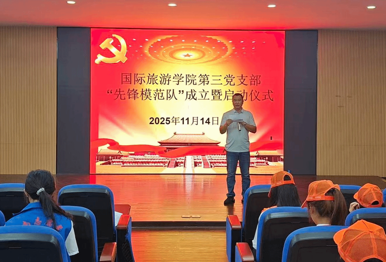 为进一步加强基层党组织建设,充分发挥学生党员的先锋模范作用,引领广大青年学子立志成才、服务社会,2025年11月14日下午,国际旅游学院于图书馆四楼VR实训室隆重举行了“先锋模范队”成立暨启动仪式。学院党总支副书记周群林、第三党支部全体党员及首期全体先锋模范队队员共同见证了这一重要时刻。