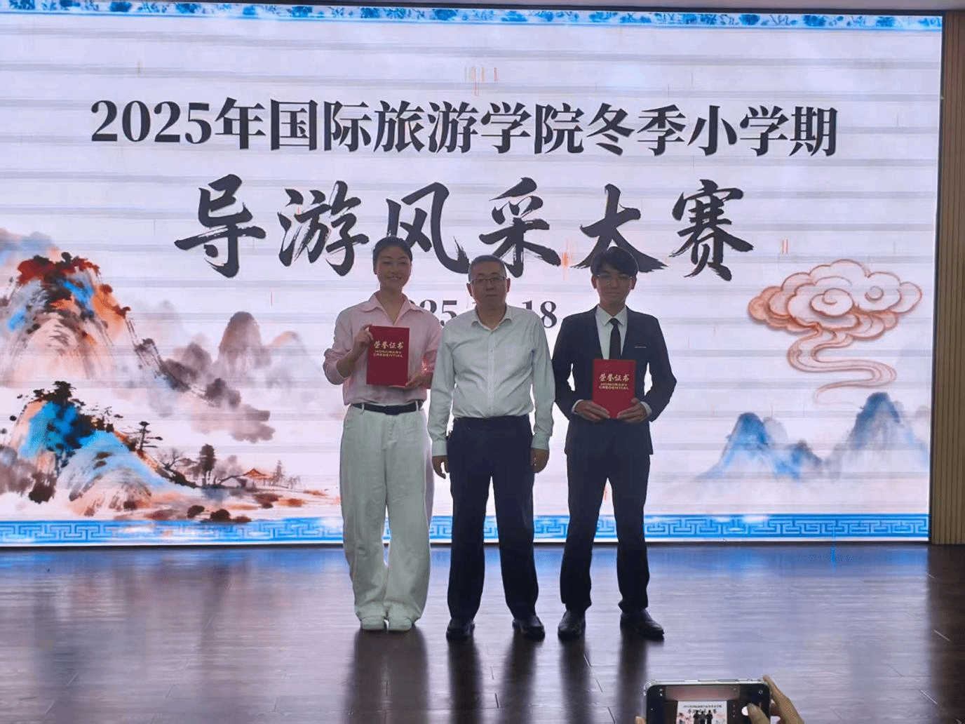 为丰富学生校园生活,展示专业风采,提升导游讲解与创作能力,11月18日晚,国际旅游学院2025年冬季小学期导游风采大赛在图书馆4楼VR教室圆满举办。经过初赛选拔的16名选手同台竞技,用专业的讲解、饱满的热情呈现了一场精彩的文旅盛宴。我院党总支副书记周群林、副院长马维娜莅临比赛现场并为获奖选手颁奖。