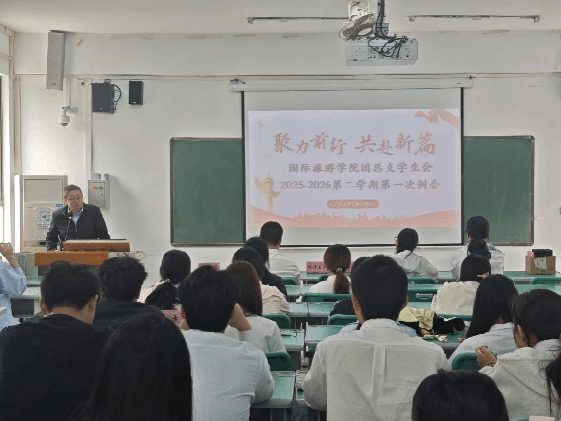 春回大地,万象更新。为明确新学期工作方向,凝聚团学骨干力量,国际旅游学院团总支学生会于2026年3月12日在多媒体15教室顺利召开2025-2026学年第二学期第一次例会。会议由团总支学生会执行主席云春雨主持,学院党总支副书记周群林、团总支书记高潇翔、学生会主席团成员、各部门部长及干事齐聚一堂,共绘新学期工作蓝图。