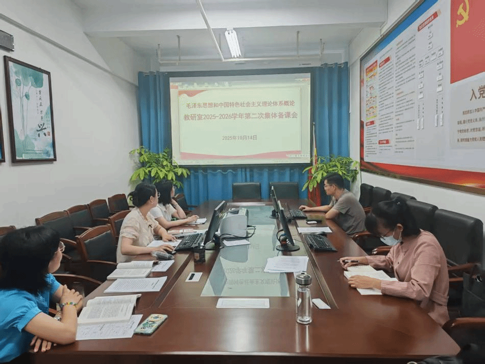 为深化落实学院课程建设总要求,推动教师教育教学水平提升,确保《毛泽东思想和中国特色社会主义理论体系概论》教育教学质量,2025年10月14日,毛泽东思想与中国特色社会主义理论体系概论教研室召开了2025年秋季学期第二次教学工作会议暨集体备课会。