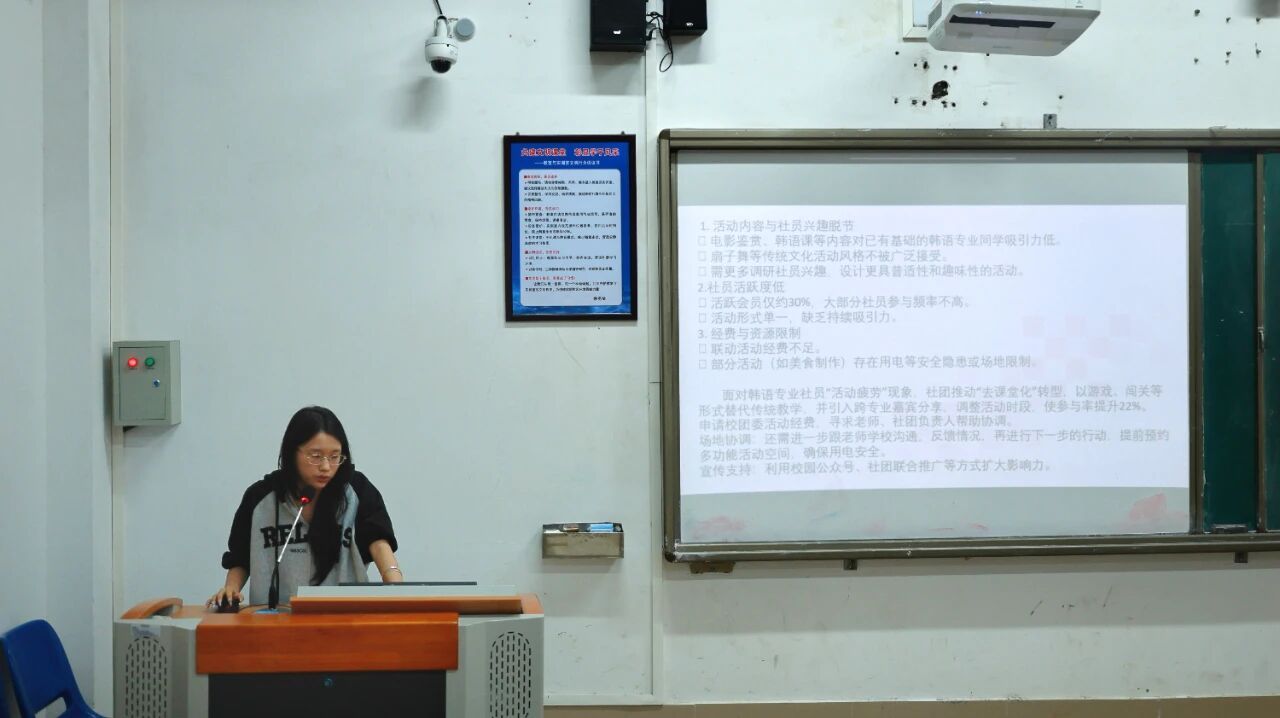 会上,我校 27 个学生社团负责人以“展示+陈述”的方式,通过精心准备的 PPT 与现场演讲,围绕 2025 年度工作实施情况、存在问题反思及 2026 年度发展计划三个方面进行了系统汇报。各负责人重点呈现了社团在个性化品牌建设、品牌活动运营、特色文化涵养等方面形成的差异化发展路径和阶段性成果,全面展现了各社团的独特定位与实践亮点。