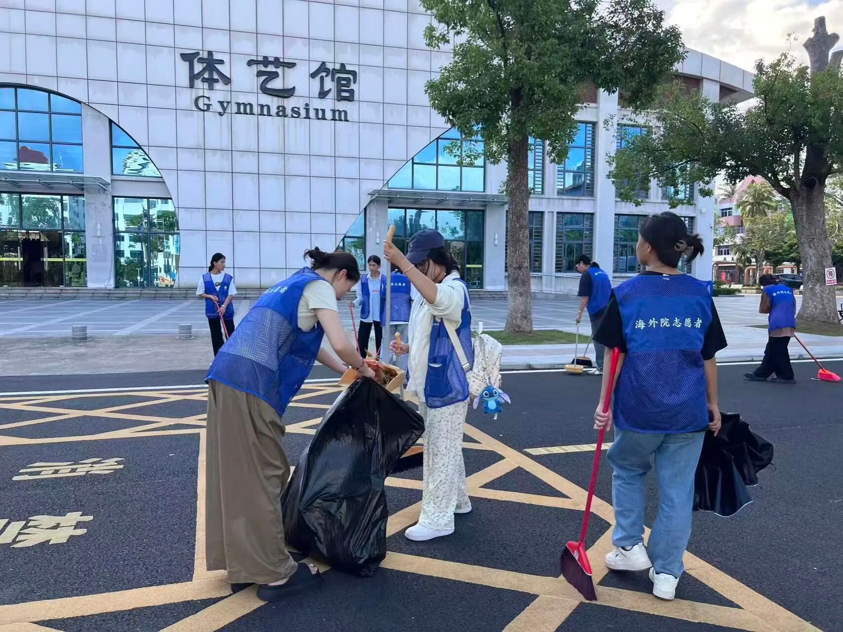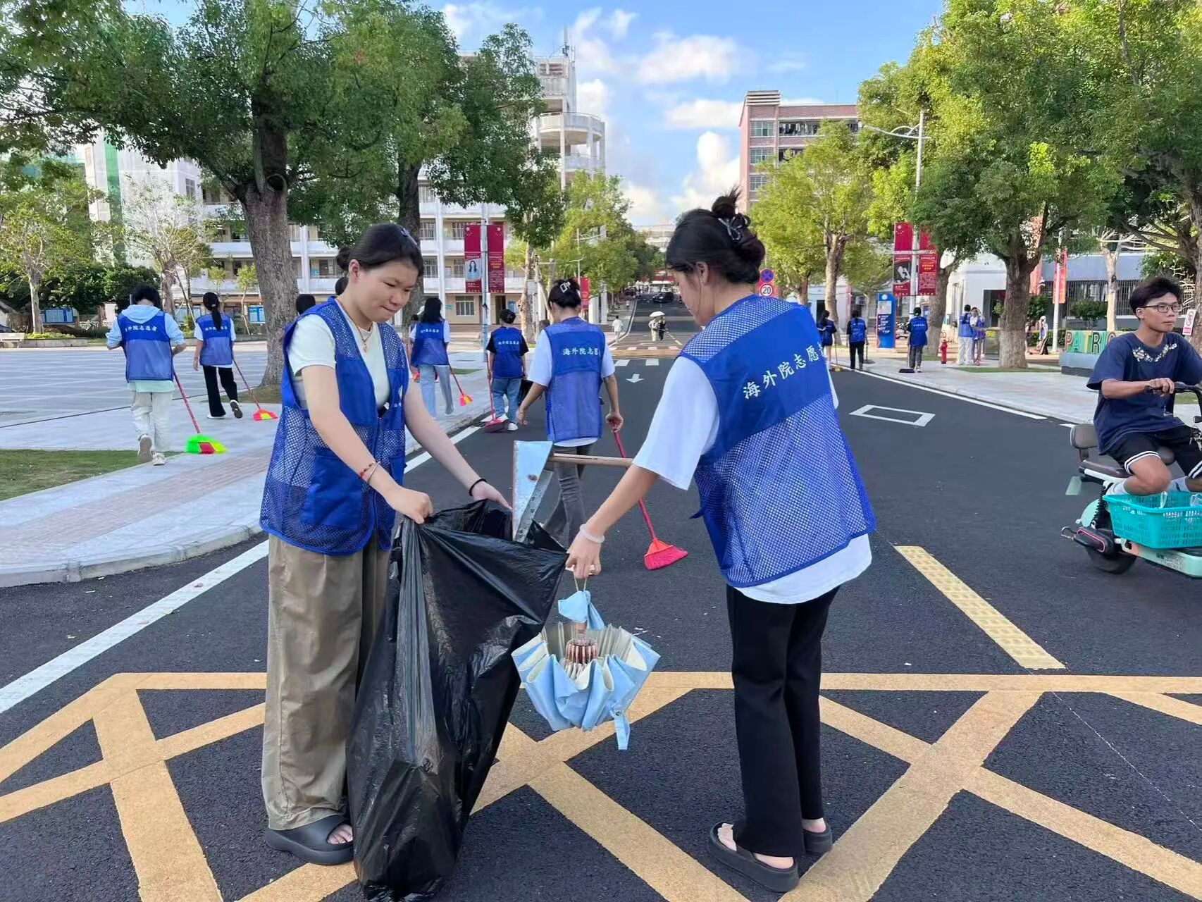 在校园的主干道上专注清扫 动作利落让积聚的落叶与尘土 一扫而空
