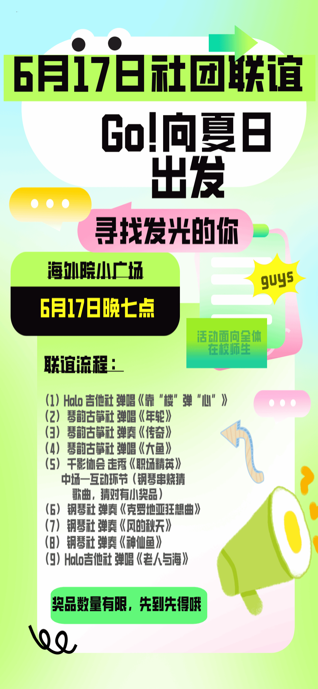 这个夏天,让我们相聚海外院小广场,在音乐与欢笑中寻找发光的自己,共同书写属于我们的夏日故事吧