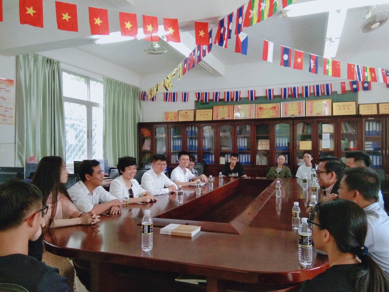 郭艳萍主任对黄万达总领事到访东语系、关心柬埔寨语专业建设与发展表示感谢。她指出,我系柬埔寨语专业于2017年开始招生,与柬埔寨波雷烈农业学院、柬埔寨管理与经济大学建立了长期的合作交流关系,目前又正在努力与金边皇家大学建立校际合作关系。希望通过此次来访,双方加强了解,推动柬埔寨语专业建设,未来在柬语学生实习基地建设方面展开合作。 柬埔寨王国驻海口总领事馆总领事黄万达对我院国际交流中心和东语系的欢迎表示感谢,并向我方介绍了领事馆的各个成员。他表示,目前中柬关系已上升为全面战略合作伙伴关系,因此加强双方的人文交往是非常有必要的,希望海外院继续培养更多懂中文、了解中国文化的优秀的柬埔寨学生,争取更多支持的渠道,促进中柬友谊长存。此外,黄万达总领事还鼓励柬埔寨语专业学生努力学好专业知识,多与柬埔寨留学生沟通交流,提升语言综合素质,为中柬两国友好关系发展贡献一份微薄之力。