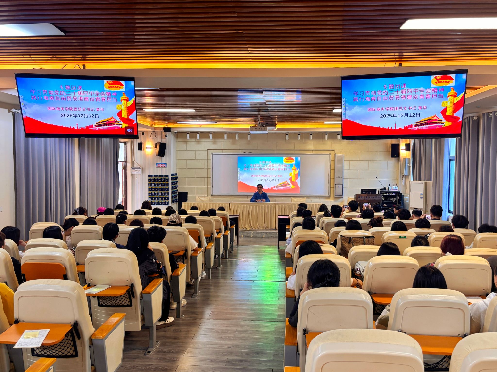 12月12日,学院团总支书记黄华在学校BE101小型学术报告厅讲授“学习贯彻党的二十届四中全会精神 践行海南自由贸易港建设青春担当”专题团课,团总支学生会全体干部、各团支部学生干部骨干共100余人到场聆听本次专题团课。