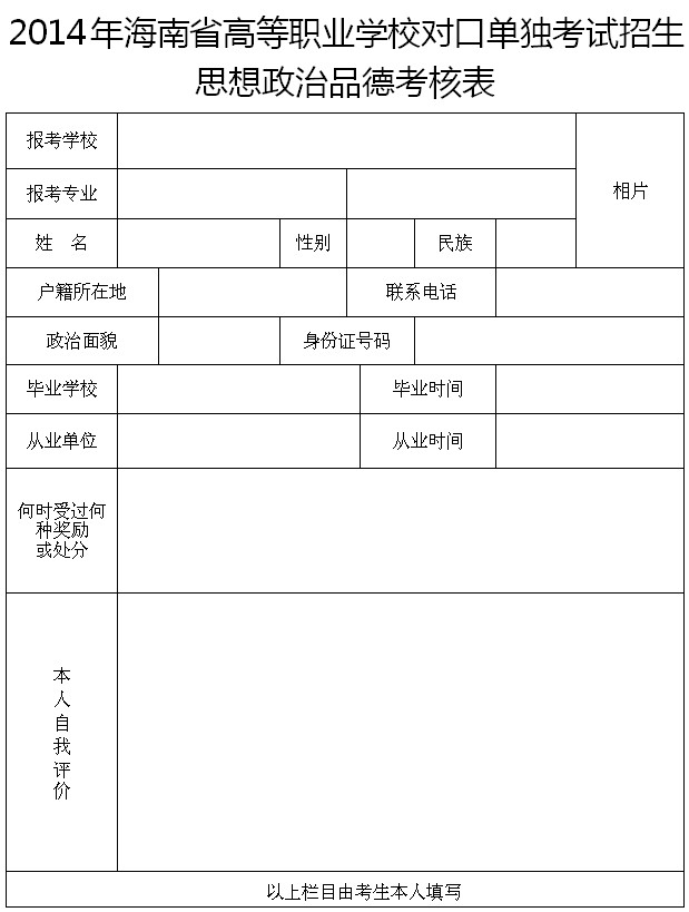 2.2014年海南省高等职业学校对口单独考试招生思想政治品德考核表