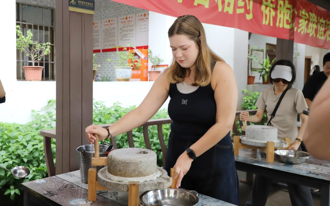 随后的古法豆腐制作体验中,石磨成为中外友人互动的纽带。来自缅甸的国际学生欧卡推动石磨,金灰白色的黑豆浆缓缓流出,在滤布中凝结成嫩滑的豆腐。“原来一块豆腐的诞生,需要这么多细腻的工序。” 他轻轻触碰凝结的豆脑,眼中满是对传统手工艺的敬意。当热气腾腾的豆腐脑配上红糖水端上桌,中外友人在味蕾的共鸣中,品出了乡土中国的温暖底色。