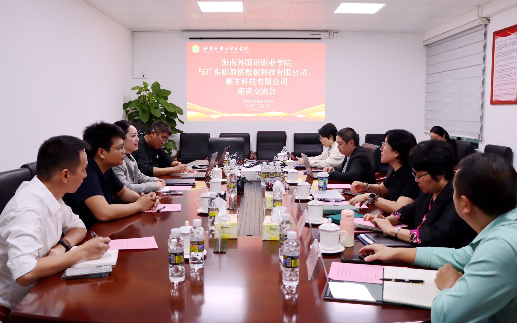 广东职教桥数据科技有限公司销售总监卢婉晴、海南区经理赵欣鑫,顺丰科技有限公司粤西区域负责人杨伟业、海南区经理符传雄,我校相关职能部门、二级学院负责人参加会议。