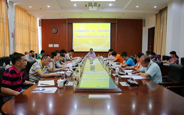 李渝凤院长指出,全省教育大会强调海南国际旅游岛和自由贸易区(港)的建设需要扩大教育开放,提高海南人民外语水平。作为我省外语语种最多、外语专业最齐的高校,我院要立足海南、辐射全国、面向国际,用全省教育大会精神指引学院科学发展,服务国家“一带一路”以及海南国际旅游岛和自由贸易区(港)建设。一是深化教育改革,继续突出“外语+”办学特色,对标海南12大重点产业需求,培养高素质涉外人才;二是要持续加强教育国际合作与交流,以“一带一路”沿线国家(地区)为重点,打造“留学海南”品牌。持续开展多层次联合办学,全面提升办学国际化水平;三是积极把握机遇,主动作为,全面推进学院新一轮改革开放,为海南全民外语提升行动计划提供智力和人才支撑,培养更多具有国际视野、跨文化交际能力、熟练运用外语的应用型人才,为海南国际旅游岛和自由贸易区(港)建设作出新的贡献。