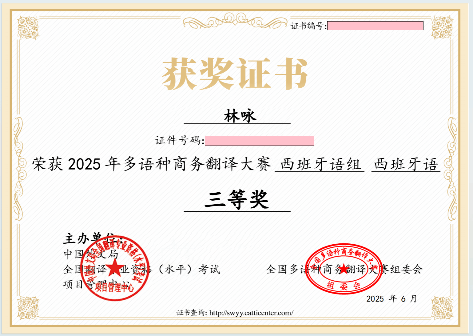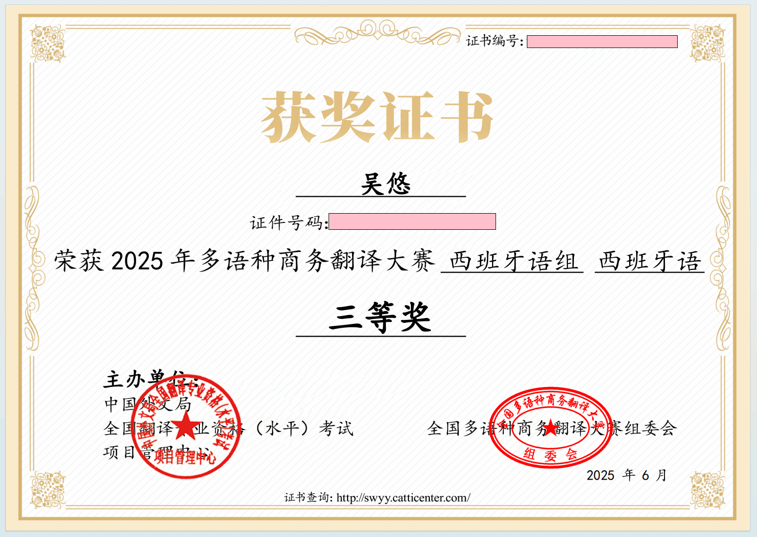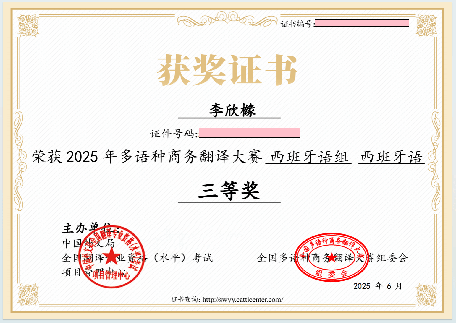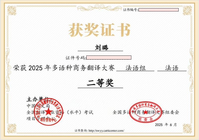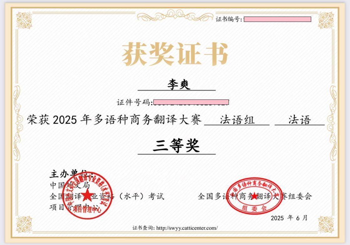 近日,由中国外文局和全国翻译专业资格(水平)考试中心联合主办的2025年全国多语种商务翻译大赛圆满落幕。作为翻译与商务外语领域的标杆性赛事,本届大赛吸引了来自全国众多高校的莘莘学子及社会翻译精英同台竞技,竞争激烈。我校西方语言学院的学生们凭借扎实的专业知识和出色的表现,在比赛中斩获佳绩,其中应用法语专业刘璐同学荣获比赛二等奖,应用法语专业李爽同学、应用西班牙语专业吴悠、林咏、李欣橼同学荣获比赛三等奖,彰显了我校学子的水平和风采,也展示了我校在外语人才培养工作的良好成果。