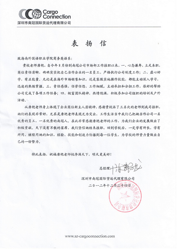 据悉,唐艳老师在深圳市南冠国际货运代理有限公司的工作岗位上,虚心学习,积极主动工作,得到了该公司领导和同事的一致肯定与好评,展现了我院教职工良好的精神风貌。