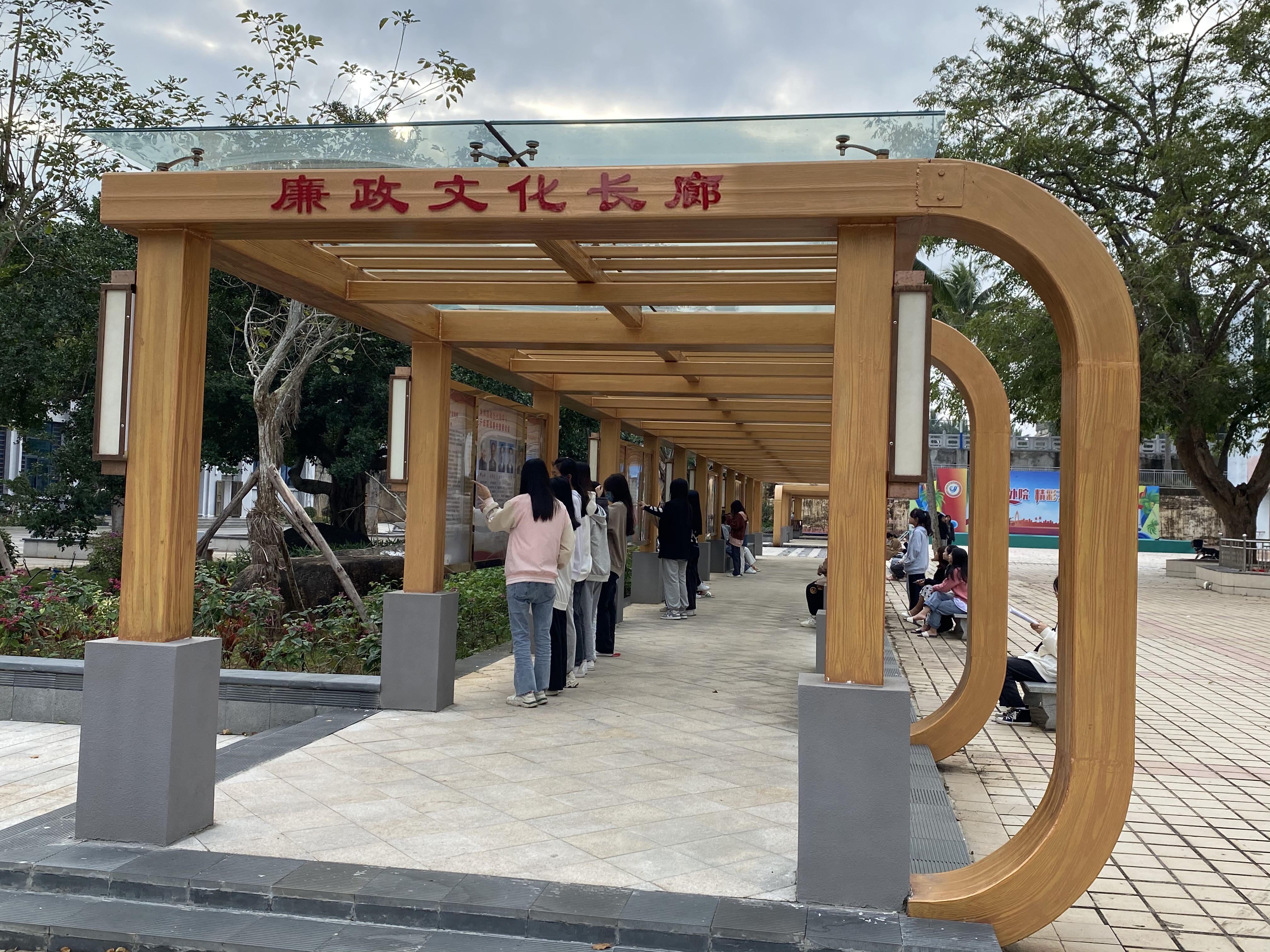 廉政文化长廊位于二号教学楼和体艺馆之间的广场,由党和国家历代领导人关于反腐倡廉的重要论述、纪委监委职责、十九届中央纪委五次全会精神及国家监察体制改革、十八大以来国家正风肃纪反腐成绩单、清廉自贸港专题、海南监督哨曝光台、党的好干部与纪检先锋、家风教育专题、古代廉政思想及清廉人物、中国反腐得到世界认可、世界反腐经验教训、执纪者说、海瑞·特别策划等十三个板块组成。所选内容融思想性、教育性、艺术性于一体,格调高雅、色调明快、主题突出、内容丰富、图文并茂、形象直观,表达了鲜明的廉政教育主题。