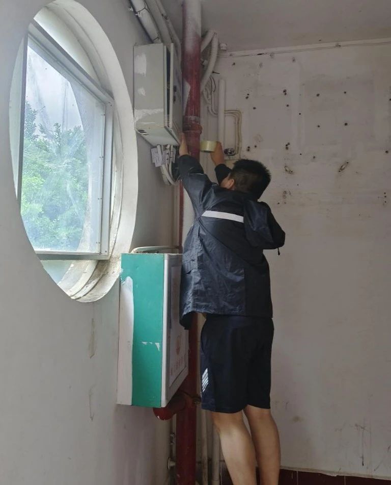 消除安全隐患。他深入学生宿舍逐间走访1、2、3栋122间学生宿舍,检查宿舍门窗是否加固关闭、走廊阳台杂物是否清理干净等,确保防风工作全覆盖、无死角。同时,不断向学生强调防范台风要点并安抚学生情绪,提前购买胶带,带领学生利用胶带加固122间宿舍门窗,防止台风吹破门窗,提醒全院255名留校学生台风登陆时利用铁架床顶住门并远离门窗。对1至3栋学生宿舍公共饮水机、电箱、电表、消防栓等进行逐一排查,利用胶带加固宿舍公共区域窗户、电箱、消防栓等20余处,做到安全无隐患。