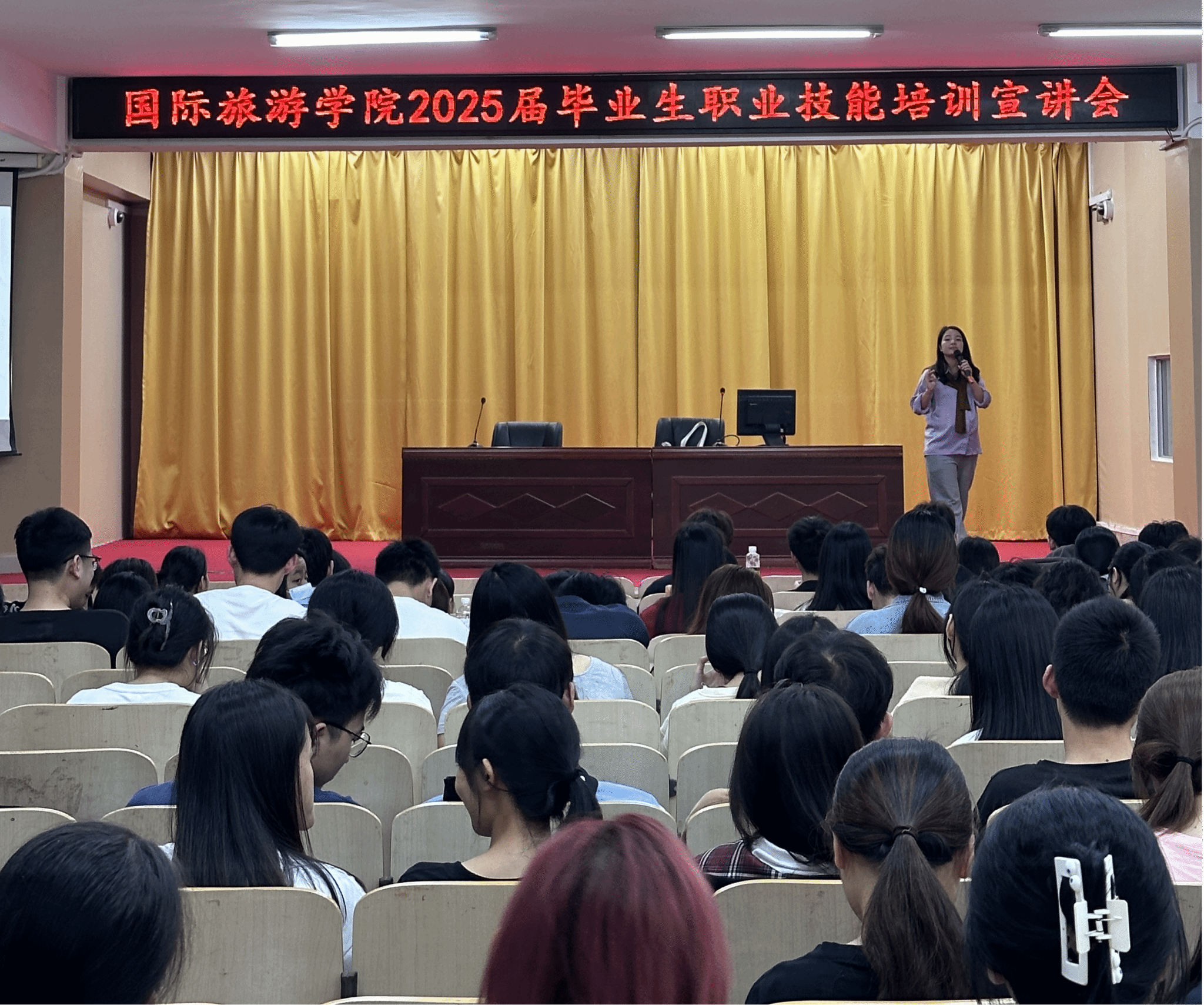 2024年3月21日下午,国际旅游学院在多功能报告厅举办了2025届毕业生职业技能培训宣讲会。国际旅游学院党总支书记、就业创业工作领导小组组长林明霞、国际旅游学院就业指导专员潘明慧以及毕业班辅导员出席了此次宣讲会。