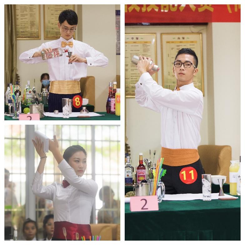 由省教育厅和人事劳动与社会保障厅共同举办的2020年海南省职业院校(高职组)技能大赛西餐宴会服务赛项10月30日在海南经贸职业技术学院落下帷幕。我校旅游系派出杨郭、苏南、杨若冰三名同学参加了本次比赛。三名同学跟来自省内5所高职院校的15名选手同台竞技,经过烈酒品鉴、葡萄酒品鉴、创意鸡尾酒调制、抽选鸡尾酒调制、西餐宴会摆台、英语台面讲解、英语口语问答、席间服务等环节的激烈角逐,共取得三个三等奖优异成绩。