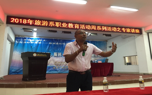 5月8日,我院旅游系在多功能报告厅开展了 “弘扬工匠精神,服务一带一路”系列专家讲座。本次职业教育活动周期间,有幸邀请到教育部旅游管理类专业教指委副秘书长、云南民族大学职业技术教育学硕导董兴教授进行《角色与专业 课程标准与资源》专题讲座。冯塘绿园总经理杜思思、三亚凤凰岛度假酒店总经理詹姆斯.拉维、三亚湾喜来登度假酒店鄢福俭和三亚亚龙湾瑞吉酒店首席管家贺俊梅也应邀来我院进行专题讲座。