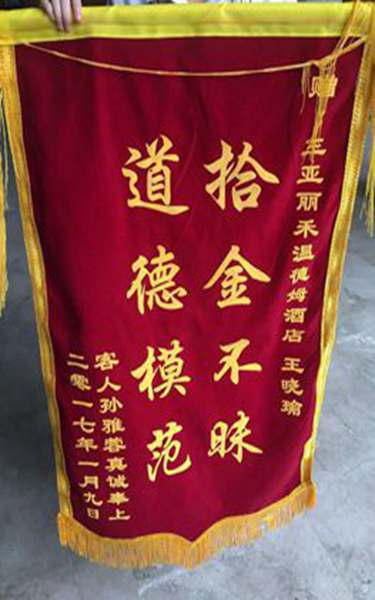 2017年1月19时左右,三亚丽禾温德姆餐饮部实习生王晓瑜当班时,于大堂吧座椅上发现有客人遗落的钱包,钱包内有1000元左右的现金、旅游餐劵和数张银行卡。面对拾到的钱包,王晓瑜想到的是失主着急的心情,与此同时并作出理性的判断,将拾到的钱包交给宾客关系主任,让其帮忙寻找失主,最终将钱包还给失主,失主为表谢意,专程至酒店感谢王晓瑜拾金不昧的行为,并送来一面写有“道德模范,拾金不昧”的锦旗,以此表彰和感谢。