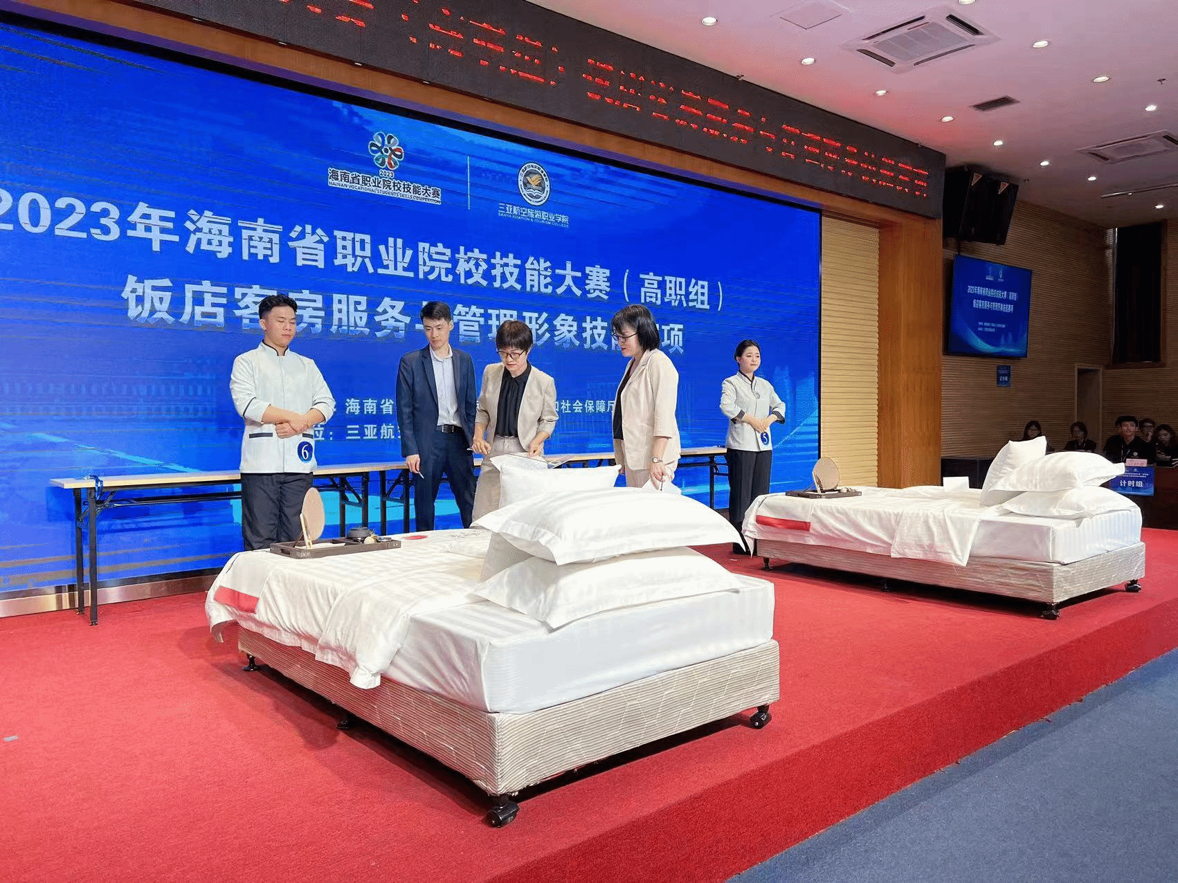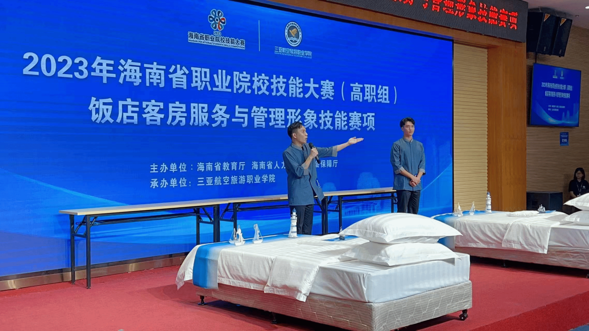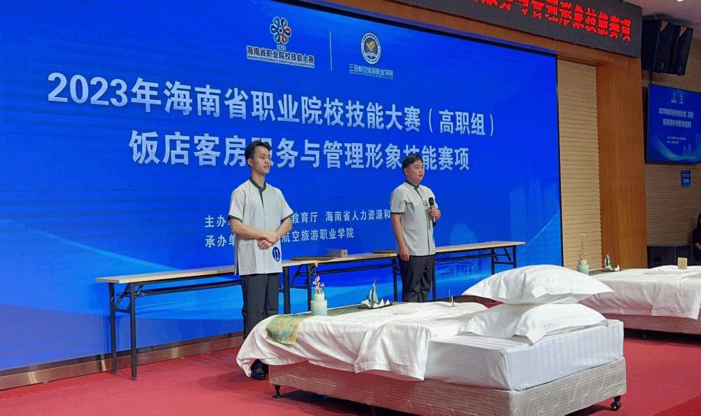 2023年海南省职业院校技能服务大赛(高职组)饭店客房服务与管理形象技能赛项于10月24日-25日在三亚航空旅游职业学院举办,我校国际旅游学院派出三支学生代表队参加比赛,分别获得全省第二名(邢益栋、陈玉信),第四名(韩明衍、谢盛朝)和第七名(王盛伟、李业辉)的佳绩。