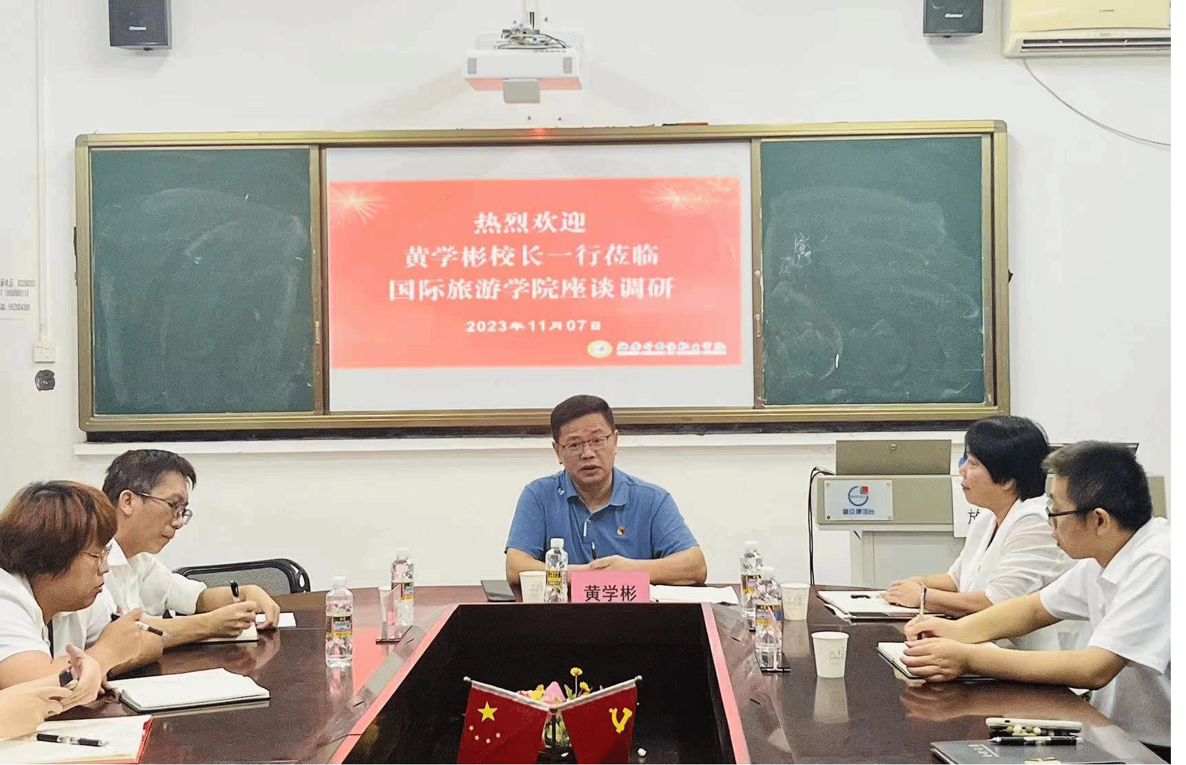 2023年11月7日下午,黄学彬校长莅临国际旅游学院调研座谈。会议由国际旅游学院党总支书记林明霞主持,副院长谢孟、党总支副书记周群林和全体教师参加座谈。