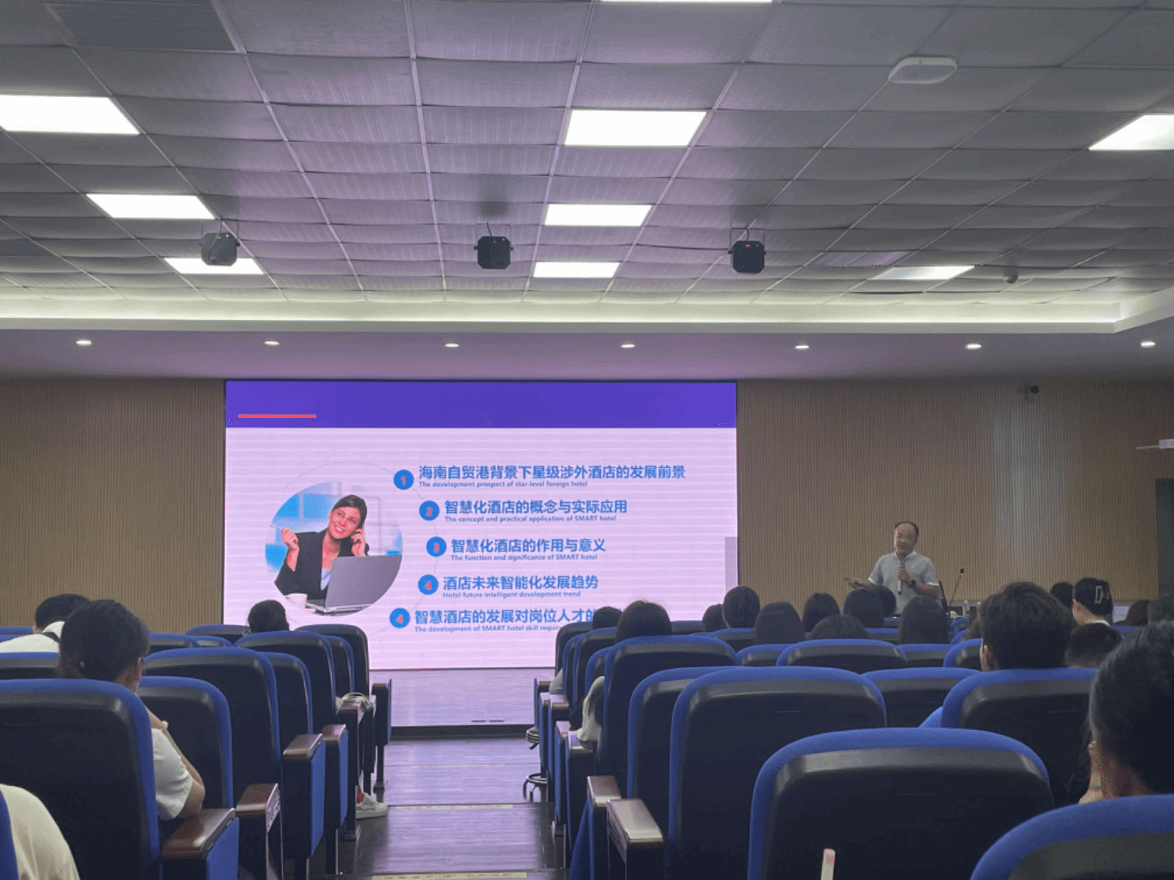 本次讲座内容涵盖了多个方面,包括海南自贸港背景下涉外酒店的发展前景以及智慧化酒店的概念与实际应用。商旭先生还深入阐述了智慧酒店的作用及意义,探讨了酒店未来智能化发展趋势,并分享了该领域对岗位人员的专业要求。