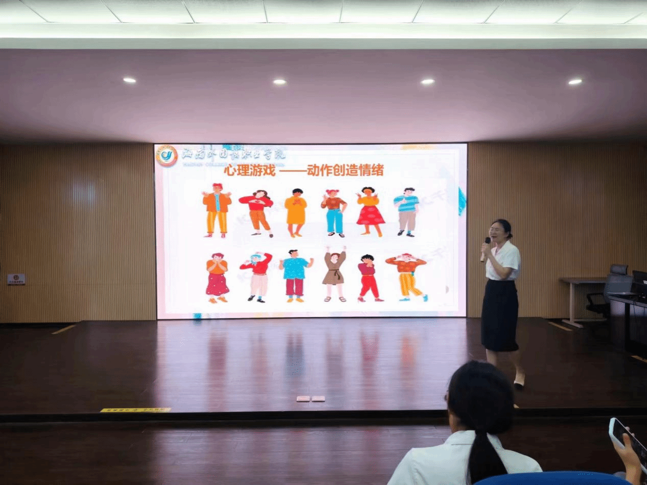 吴则老师结合心理学理论、身心发展特点等知识为同学们量身定做了互动小课堂,让同学们在互动的心理游戏之中,感受动作创造情绪的过程。