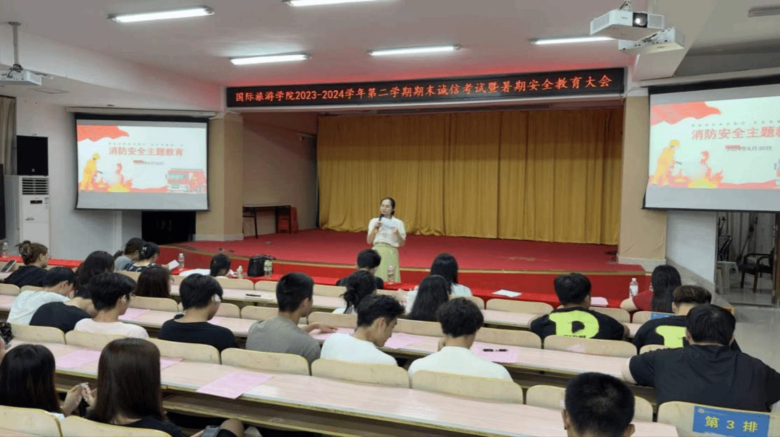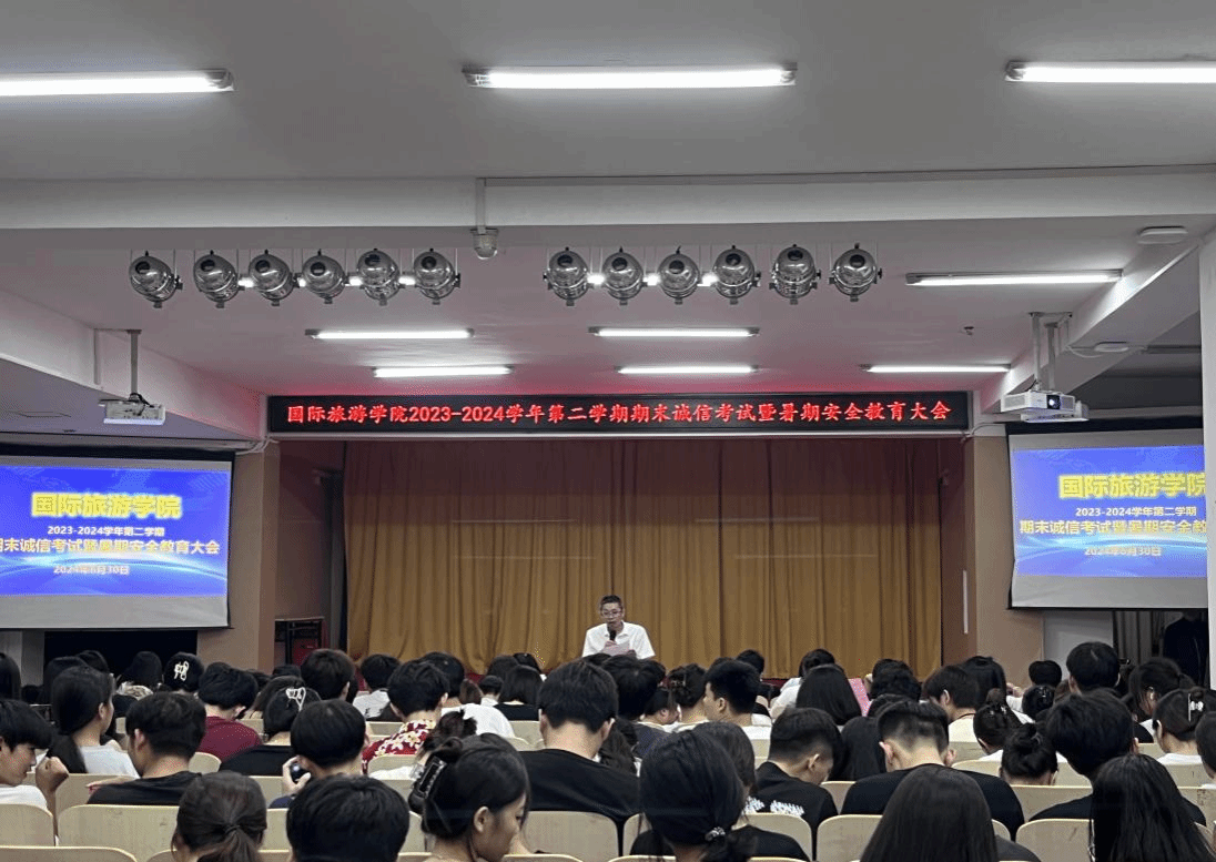 为进一步严肃考试纪律、做好假期安全教育,国际旅游学院于2024年6月30日晚上在多功能报告厅召开2023-2024学年第二学期期末诚信考试暨暑期安全教育大会。会议由学生科科长陈奕埔主持,党总支副书记周群林和辅导员、班主任代表出席会议。