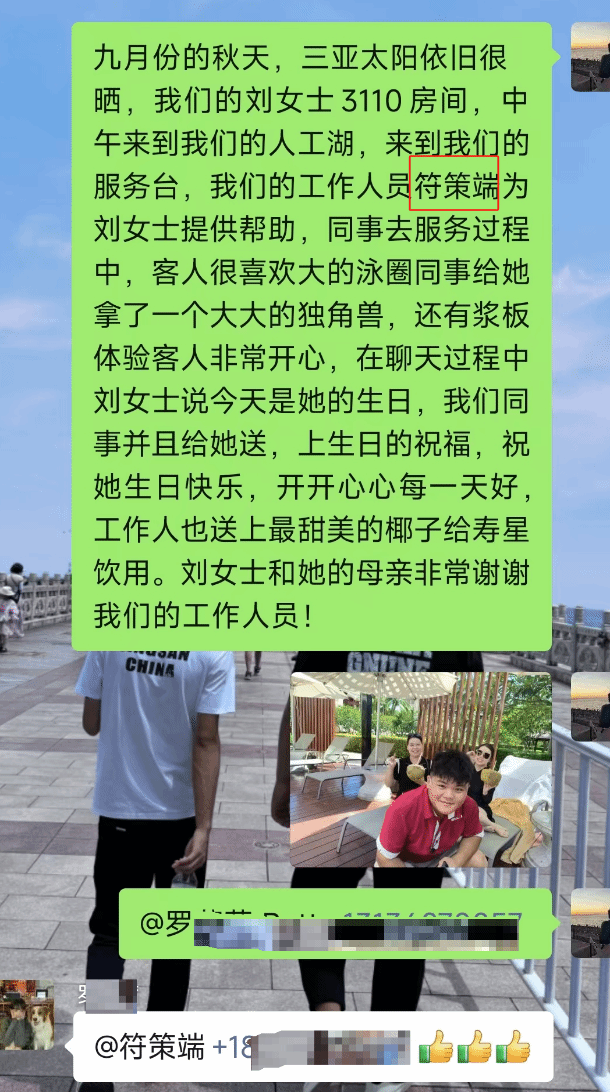 左图:康乐部实习生宋佳莉在岗认真工作;  右图:康乐部实习生符策端分享客人与部门好评