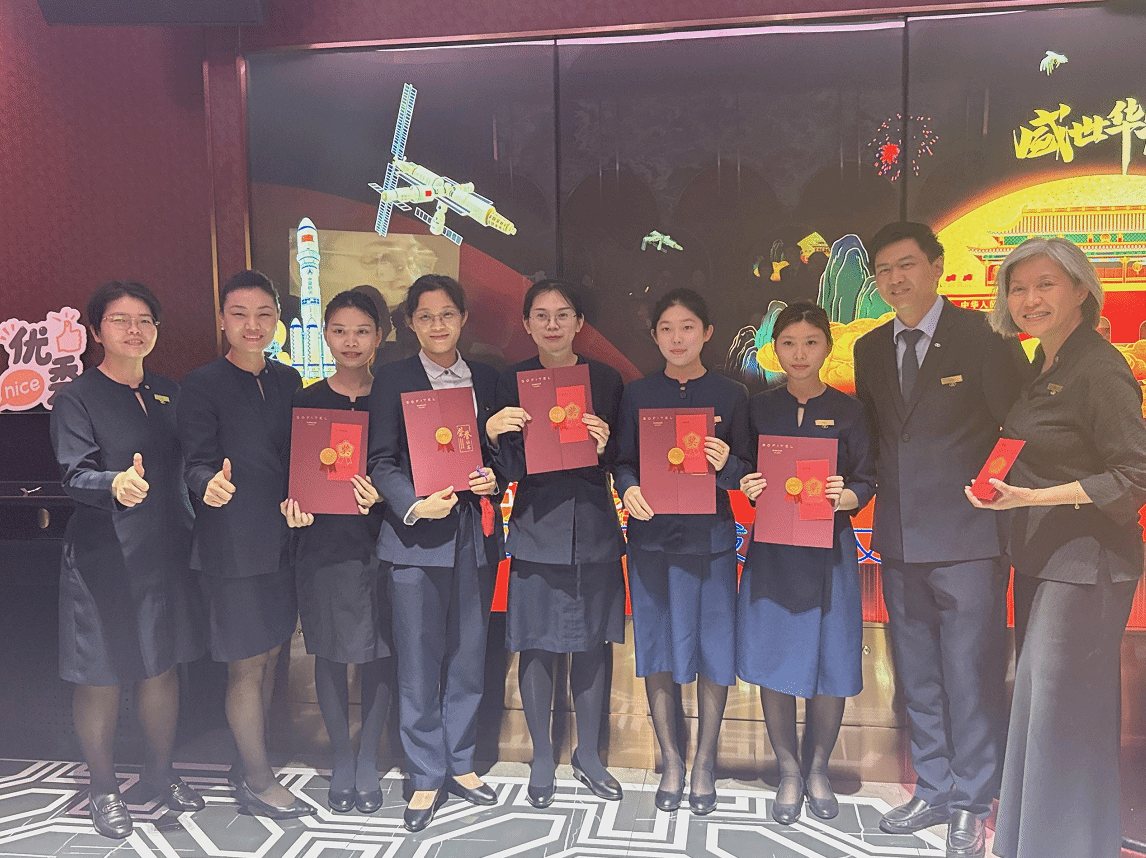 陈燕萍的专业表现和对客户服务的热忱赢得了客人的高度评价,她多次获得客人的点名表扬,这不仅是对她个人努力的认可,也是对她职业素养的肯定。她的出色表现使她荣获了索菲特酒店第一季度优秀新生荣誉称号,这是对她在实习期间卓越贡献的最好证明。