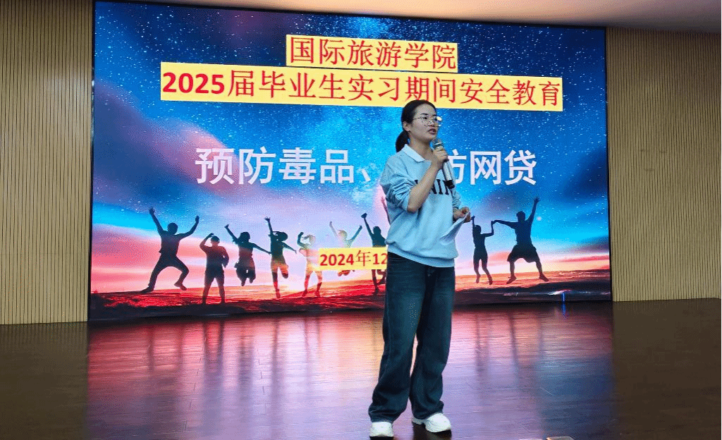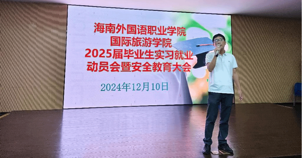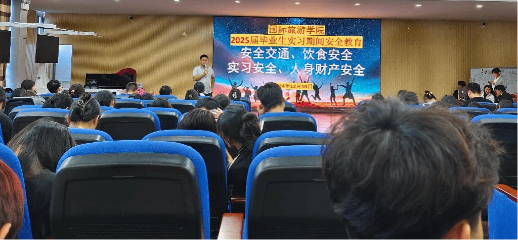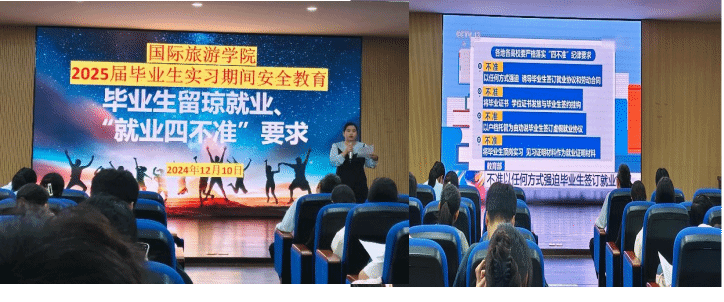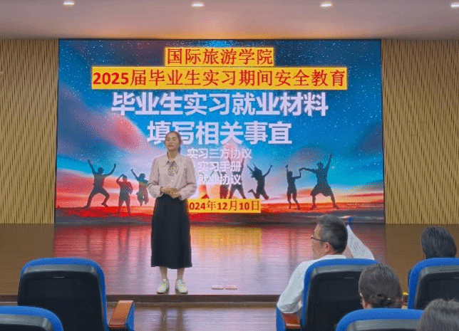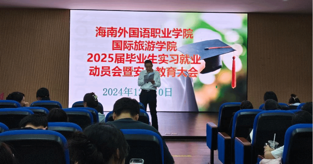 2024年12月10日,国际旅游学院2025届毕业生实习就业动员会暨实习安全教育大会在我校图书馆VR导游实训室召开,国际旅游学院谢孟副院长、周群林副书记、教研室主任、实习就业指导老师和2025届12月参加岗位实习的毕业生参会。