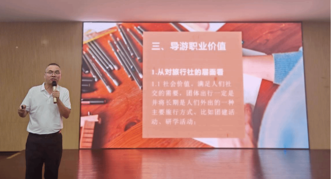 讲座中,张建强以其丰富的从业经历和扎实的专业功底,围绕“导游技能提升与职业发展规划”主题展开深入讲解。作为国家金牌导游、高级英语导游,张老师结合自身多年来为各国政要、贵宾提供导游服务的宝贵经验,从导游职业价值、行业发展前景、导游资格证考试备考策略等多个维度进行了全面讲授。在导游词创作与讲解技巧环节,他通过落笔洞等具体景点案例,以及示范讲解,生动展示了不同讲解技巧的实际运用效果,让抽象的理论知识变得具体可感。