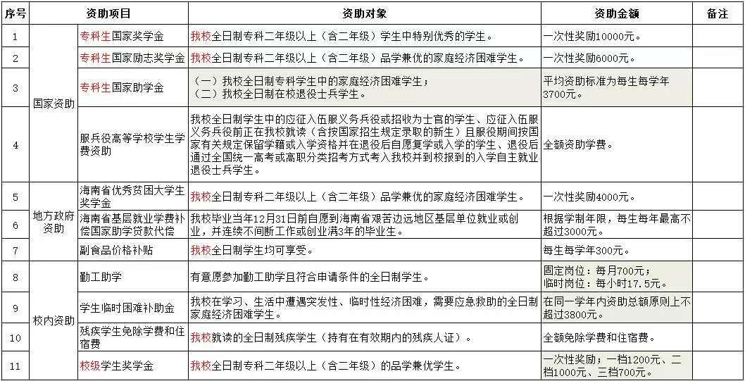 学校提供国家奖学金、国家励志奖学金、国家助学金、海南省优秀贫困大学生奖学金、学校学生奖学金等奖助学金,并为有意愿参加勤工助学且符合申请条件的学生提供勤工助学机会。