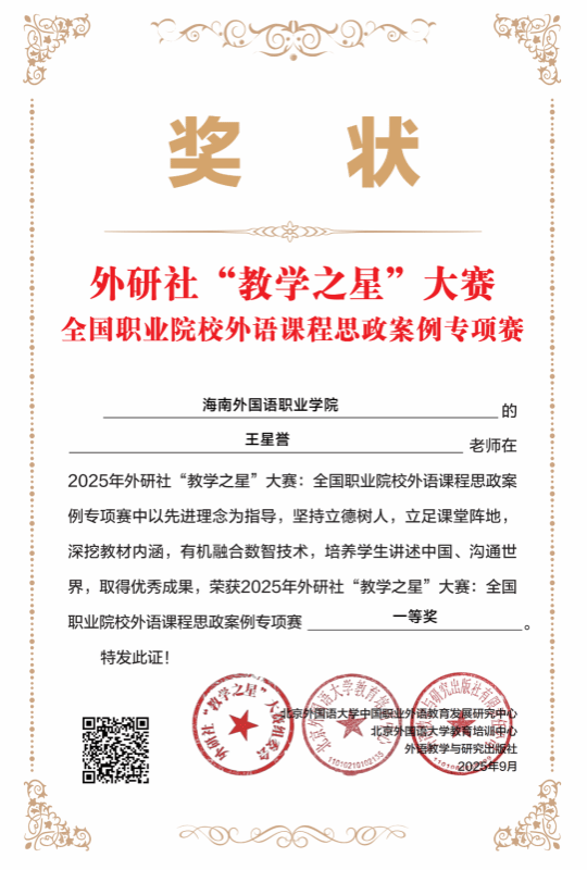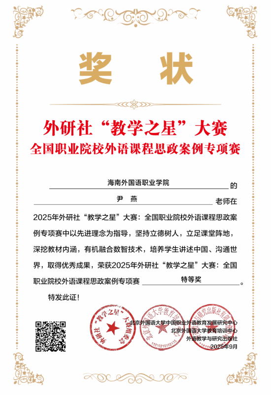 2025年9月9日,2025 年外研社 “教学之星” 大赛 —— 全国职业院校外语课程思政案例专项赛获奖名单重磅揭晓。在这场聚焦职业院校外语课程思政建设的年度赛事中,国际旅游学院传来振奋人心的喜讯:尹燕老师和王星誉老师凭借精妙的教学设计与深厚的育人思考,一举斩获高职英语组特等奖和中职英语组一等奖。两位教师的亮眼成绩,不仅为学院赢得了全国性荣誉,更充分彰显了我院在国际旅游服务人才培养课程思政领域的建设成果与教师队伍的硬核实力。