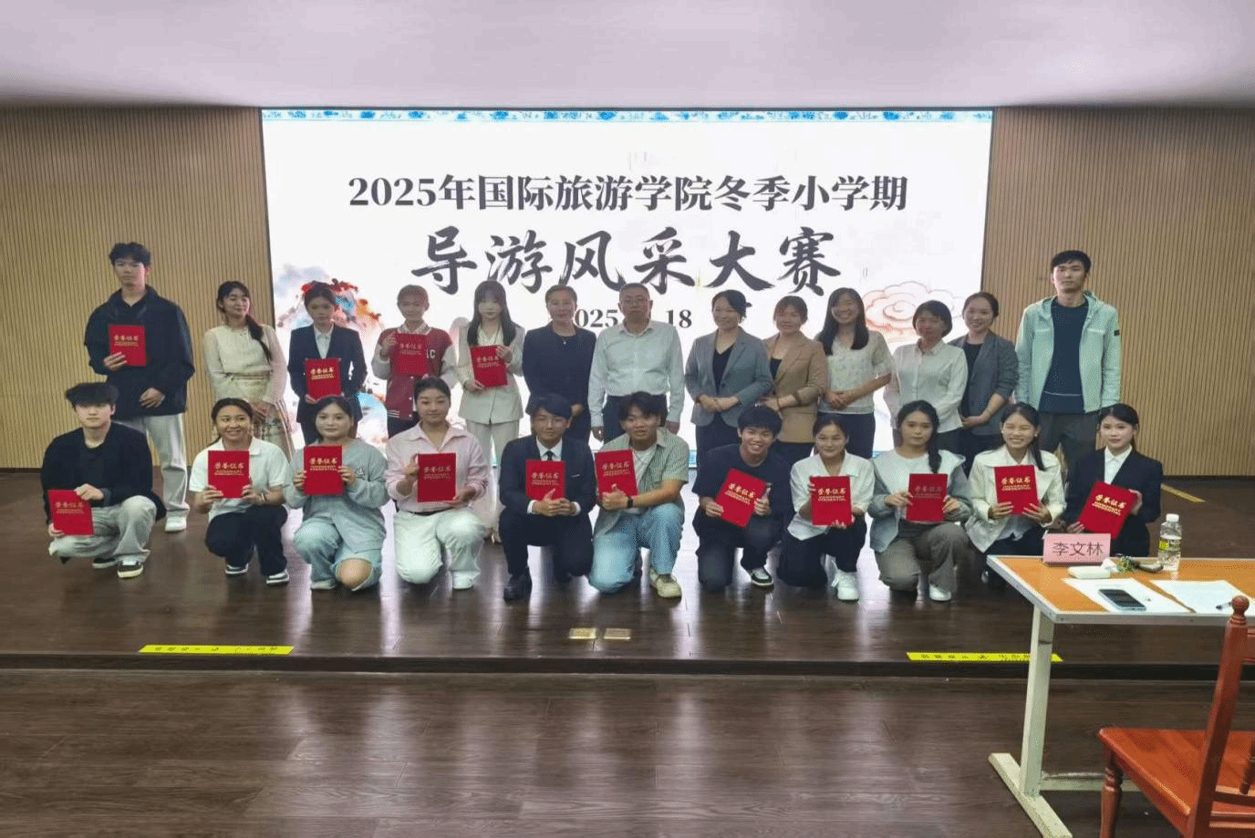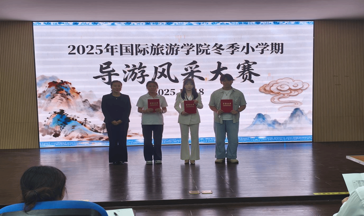 为丰富学生校园生活,展示专业风采,提升导游讲解与创作能力,11月18日晚,国际旅游学院2025年冬季小学期导游风采大赛在图书馆4楼VR教室圆满举办。经过初赛选拔的16名选手同台竞技,用专业的讲解、饱满的热情呈现了一场精彩的文旅盛宴。我院党总支副书记周群林、副院长马维娜莅临比赛现场并为获奖选手颁奖。