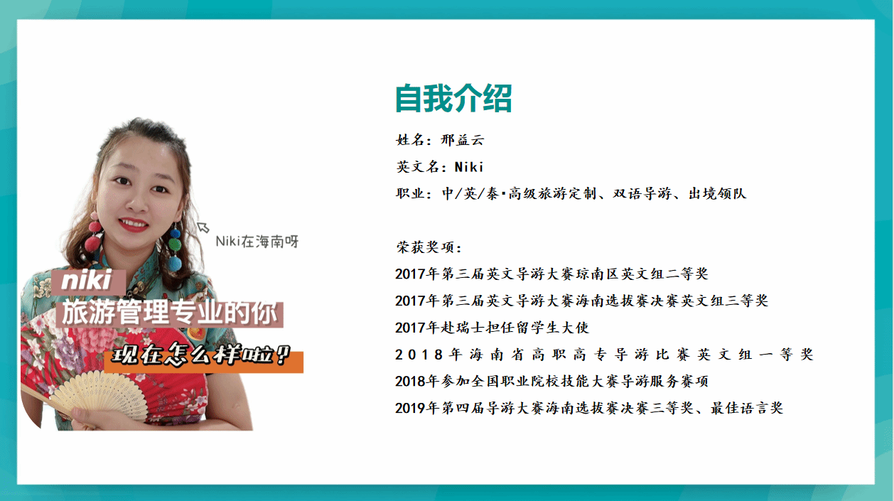 大家好!我是 2016 级旅游管理 3 班的邢益云,2018 年从母校毕业,现任海南百事通国际旅行社多语种旅游定制师。回到母校和大家交流,倍感亲切,也感谢学校提供的机会。