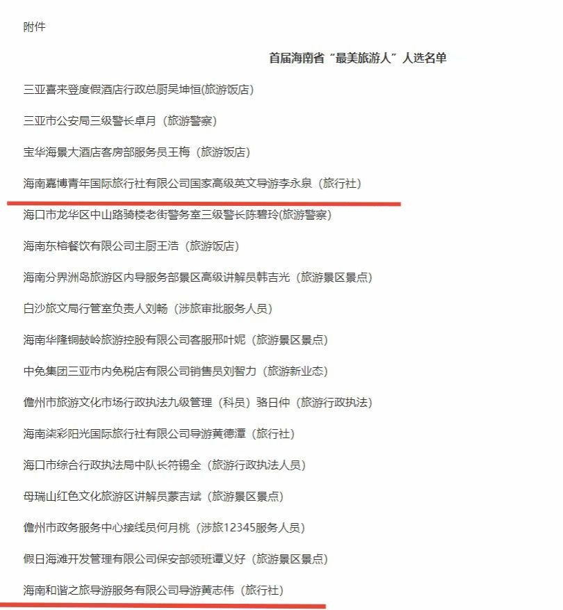 5月19日,在第14个“中国旅游日”到来之际,首届海南省“最美旅游人”选树活动及旅游服务质量提升行动发布会在海南省图书馆举行。在此次“最美旅游人”选树活动中,经过公众投票、专家评审等严格程序,我校国际旅游学院李永泉老师和杰出校友黄志伟同学凭借着出色的专业素养和突出的工作表现,脱颖而出,成功入选!
