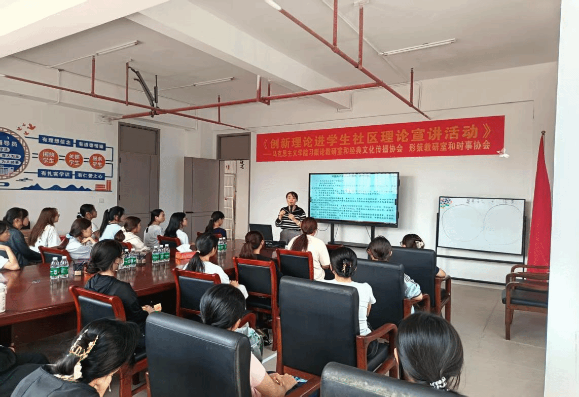 10月31日,我校学生社区内暖意融融、互动热烈。马克思主义学院《习近平新时代中国特色社会主义思想概论》课教研室携手经典文化传播协会、《形势与政策》课教研室联合时事协会,共同开展“创新理论进学生社区”主题宣讲活动,将理论课堂搬进生活场景,让党的创新理论在青年心中落地生根。