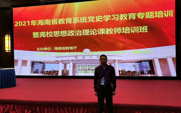 2021年3月24日-3月28日,省教育厅主办、海南大学马克思主义学院承办的2021年海南省教育系统党史学习教育专题培训暨高校思想政治理论课教师培训班在澄迈举行,思政部选派形势与政策课教研室主任周群林参加此次培训。