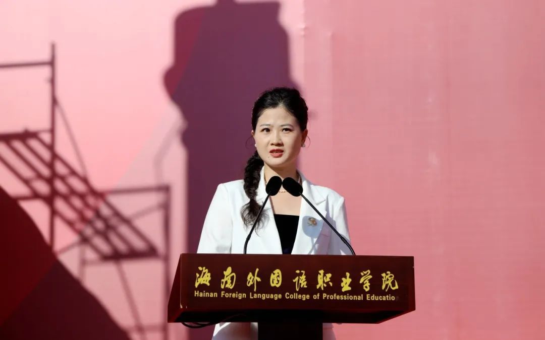陈正强为新生代表佩戴刻着“海南外国语职业学院”九个字的校徽,标志着新生们正式成为海南外国语职业学院的一员。