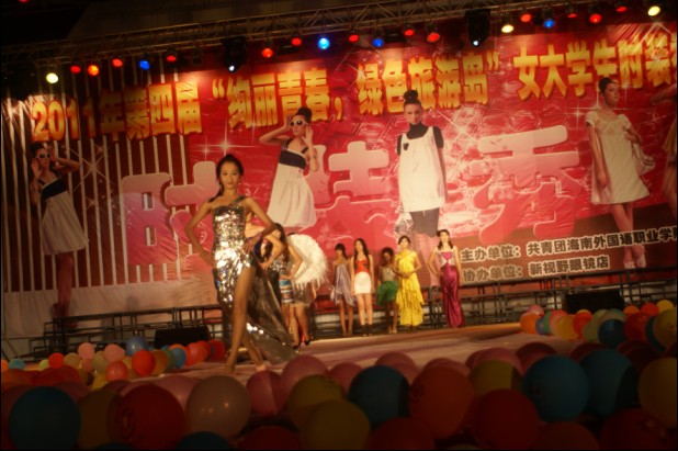 (记者联合会记者 舒雪)4月21号晚我院在新体育场隆重举行了第四届女大学生时装秀决赛,本次比赛以“绚丽青春,绿色旅游岛”为主题,由共青团海南外国语职业学院委员会主办,文昌新视野眼镜店协办,旨在丰富大学生的校园文化生活,为大学生展示自我、张扬个性创造一个平台;同时也是为了响应党中央的号召,积极宣传和支持海南的国际旅游岛的建设。担任本次晚会的评委有团委袁力伟书记、吴敏老师、闫英老师、陶能清老师、符润泉老师、王琼儿老师、郑有进老师。出席本次晚会的嘉宾有商务英语系团总支书记黄华老师等相关领导以及全体在校学生。