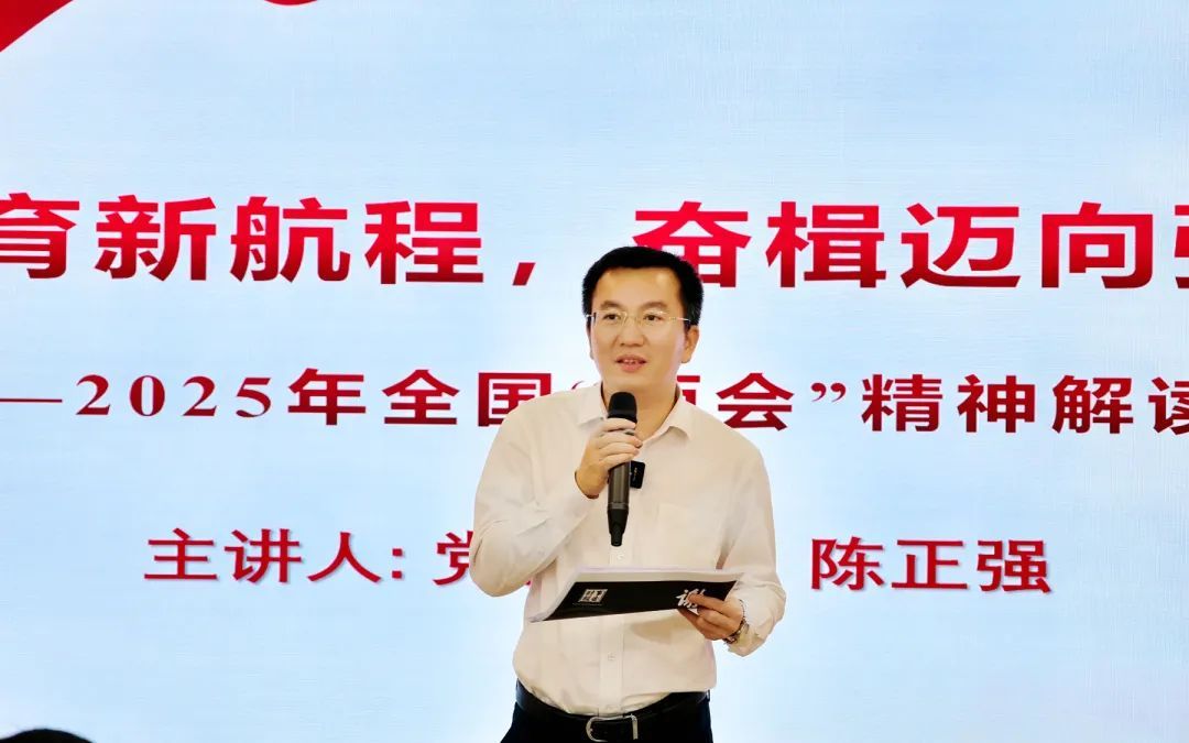 陈正强以《扬帆教育新航程 奋楫迈向强国梦——2025年全国两会精神解读》为题,分别从学习政府工作报告、把握稳中求进工作总基调,加快教育转型步伐、开启教育强国新征程,贯彻落实两会精神、凝心聚力铸就强国梦三个方面,向师生宣讲全国两会精神。