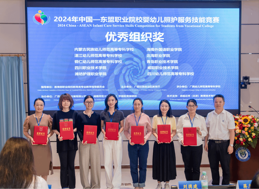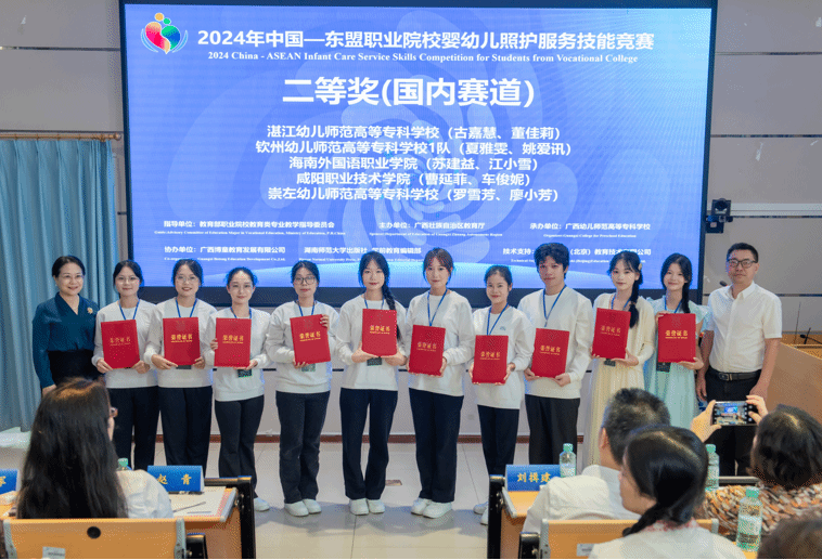 11月13日至16日,2024年中国-东盟职业院校婴幼儿照护服务技能竞赛在广西举行。比赛分国内、国外两个赛道,国内赛道有来自12个省份的38支参赛队共76名选手参赛。我校英语学院学生苏建益、江小雪荣获比赛二等奖,我校荣获优秀组织奖,彰显我校学子良好的专业风采,也为学校争得荣誉。
