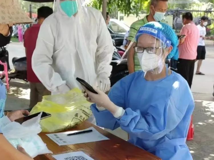 在工作的那些日子,我每天都需要5:30左右起床,6:00出发,经过半小时的车程到达目的地,然后做准备工作。为了安全,我们都是要穿厚重的防护服、戴手套及面罩才能开始工作。因为在工作的过程并没有时间轮班休息,所以我需要一直拿着手机录入个人信息,也一直在采样。我看向了我身旁的工作人员,他的防护服上一直渗出汗珠,即便再热也不能停,因为后面还有村民在等着我们,直到下午1:00工作结束,工作又热又累,非常不容易。但想想那些身在最前线的英雄,心里会不自觉地生出一种敬佩之情,他们真的很伟大。