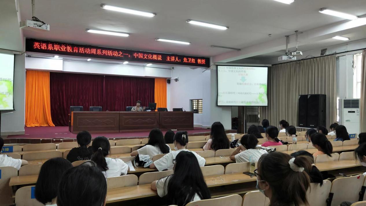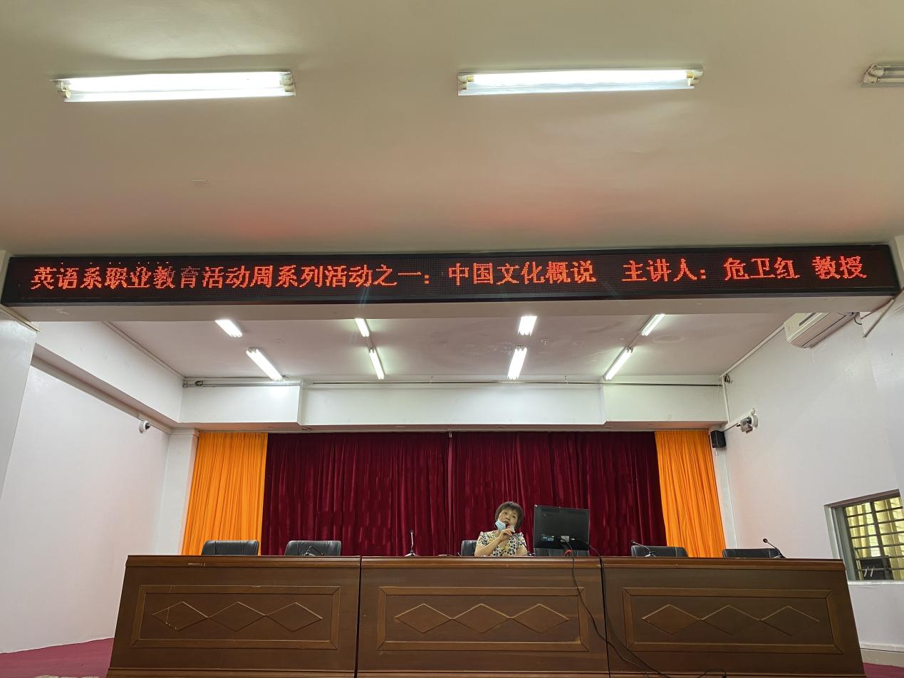 为了提高英语专业学生的文化素养,加深学生的文化底蕴,促进学生文化素质的全面发展,5月9号下午,英语系应用英语教研室在图书馆多功能报告厅举行了主题为《中国文化概说》的讲座。此次讲座是我系职业教育活动周的系列活动之一,也是我系开展“名师讲堂”的活动内容之一。我们特邀人文艺术系危卫红教授给20应英专业的学生上一节中国传统文化课。